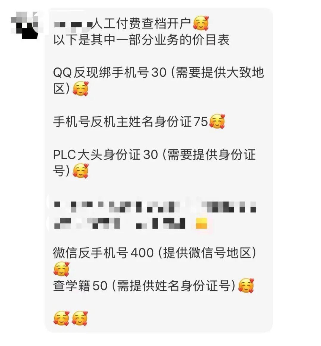 他向南都记者提供了一份“人工付费查档开户”的清单。其中写到,“QQ反(馈)手机号30元,手机号反(馈)机主姓名、身份证75元,查学籍50元,微信反(馈)手机号400元。”