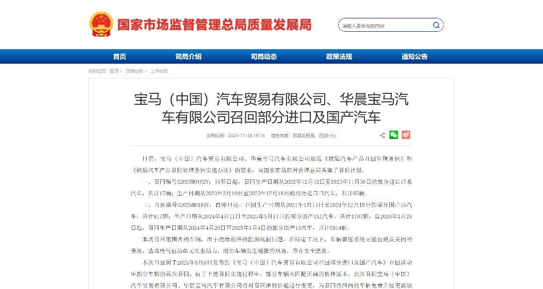 本次召回属于2025年8月8日发布的《宝马(中国)汽车贸易有限公司召回部分进口及国产汽车》召回活动中部分车辆的再次召回。由于上述召回实施过程中,部分车辆未匹配正确的软件版本,此次召回宝马(中国)汽车贸易有限公司、华晨宝马汽车有限公司将对召回维修措施进行变更,为召回范围内的车辆免费升级更高版本的软件,以消除安全隐患。